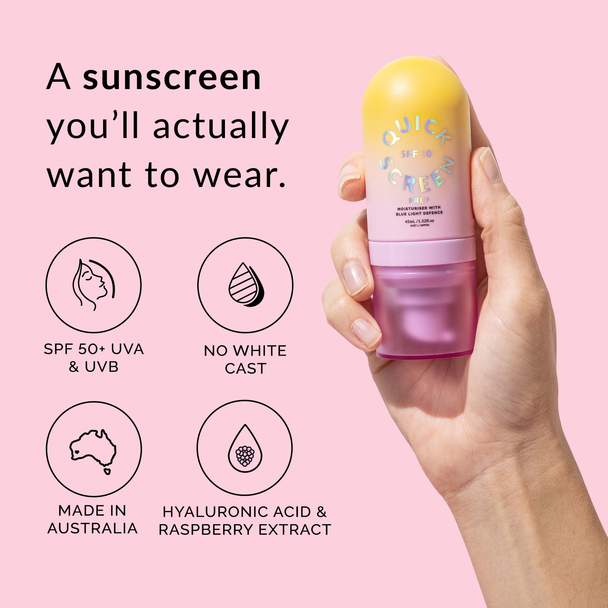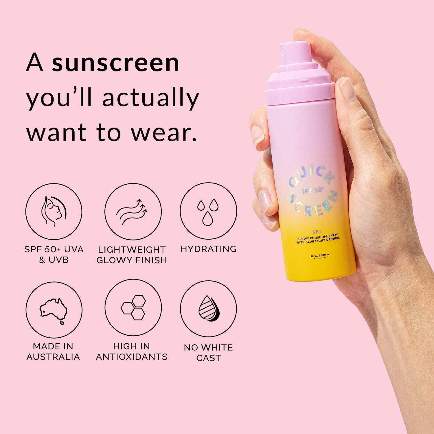 - Includes Quick Screen Prep SPF50+ Primer and Moisturiser and SPF50+ 3 in 1 Sunscreen, Setting Spray & Hydration Mist
