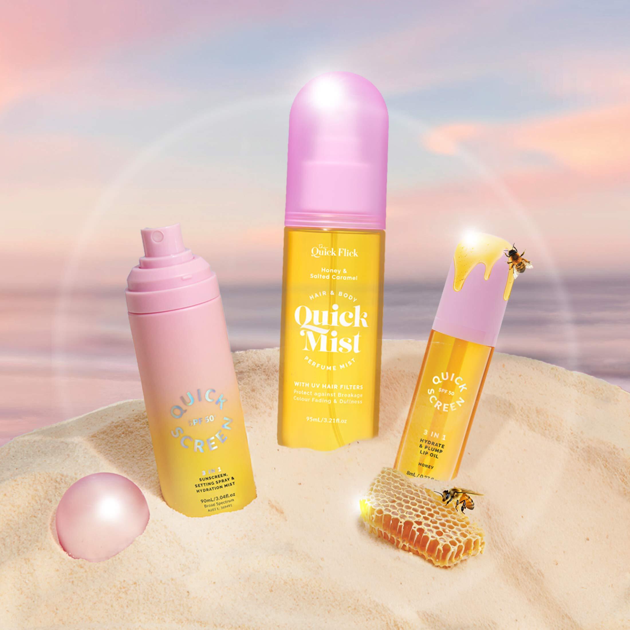 SPF50 3 in 1 Hydrate & Plump Honey Lip OilPolybutene, Homosalate, Octocrylene, Octyldodecanol, Ethylhexyl Salicylate, Butyl Methoxydibenzoylmethane, Isopropyl myristate, Flavour, Poly C10-30 Alkyl Acrylate, Simmondsia chinensis (Jojoba) seed oil, Vegetable oil, Prunus Amygdalus Dulcis (Sweet Almond) Oil, Vitis Vinifera (Grape) Seed oil, Sucralose, Honey, CI 75120.3 in 1 Hair & Body Perfume Mist with UV Hair FiltersAqua (Water, EAU), Alcohol Denat., Fragrance (Parfum), PEG-40 Hydrogenated Caster Oil, Salvia Hispanica Seed Oil, Argania Spinosa Kernal Oil, Phenoxyethanol, Polysorbate 20, Glycerin, Cyclomethicone, Xanthan Gum, Citric Acid , Helianthus Annuus Seed Oil, Diethylamino Hydroxybenzoyl Hexyl Benzoate, Tocopherol.